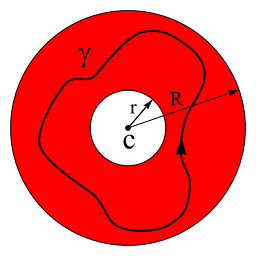 That being said, we can usually work our way around such singularities, especially when they are isolated, such as in this example (there is only this one point 1 that is causing trouble), and that is where the concept of analytic continuation comes in. However, before I explain this, I should first introduce Laurent’s theorem, which is like Taylor’s theorem but it applies to functions which are not as ‘nice’ as the functions for which Taylor’s theorem holds (i.e. functions that are not analytic everywhere), such as this 1/(1-z) function indeed. To be more specific, Laurent’s theorem says that, if we have a function f which is analytic in an annular domain (i.e. the red area in the illustration below) centered at some point z0 (in the illustration below, that’s point c) then f(z) will have a series representation involving both positive and negative powers of the term (z – z0).