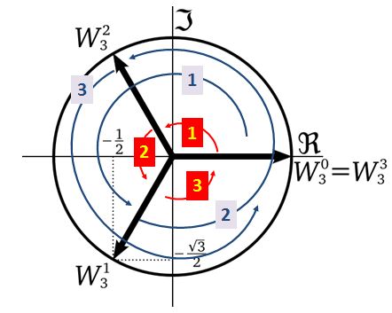 With complex numbers, it all depends. The 3rd root (i.e. the cube root) of 1 was only 1 in the real space but, in the complex space, we have three 3 cube roots of unity. The first one (W= W3) is the root we’re used to: unity itself, so the angle here is zero, i.e. straight ahead. In fact, with 1, we just stay where we are: 1×1×1 = 1= 1 indeed. But that’s not the only way. The illustration below shows two other ways to end up where we are (i.e. at point 1):