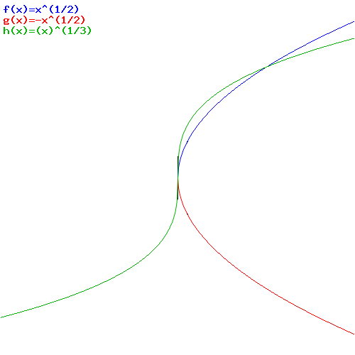 You should also note that most applications, like the one I use to draw simple graphs like the ones above (rechneronline.de/function-graphs) are not capable of showing you both roots. They do check whether the exponent is even or odd though, because it plots the function x1/3 on both sides of the zero point, and the  x1/2 graph on the positive side only: it’s just not capable to associate more than one y value with one x value indeed. [In case you’re curious to see what it does with an irrational exponent, go and check it yourself: you can put in x^pi or x^e. Will it give function values for negative values of x as well? What’s your guess? :-)]