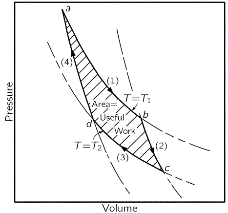 - Then we would bring the cylinder in touch with the T1 reservoir and further compress the gas so an amount of heat equal to Q1 is being delivered to the boiler at (the higher) temperature T1 (isothermal compression). So we move along line segment (1) from b to a.