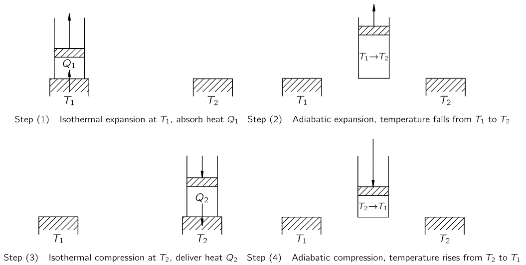 Schematically, Carnot’s reversible heat engine is represented as follows: