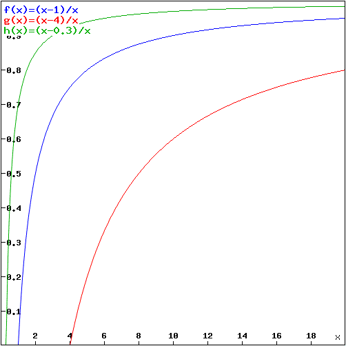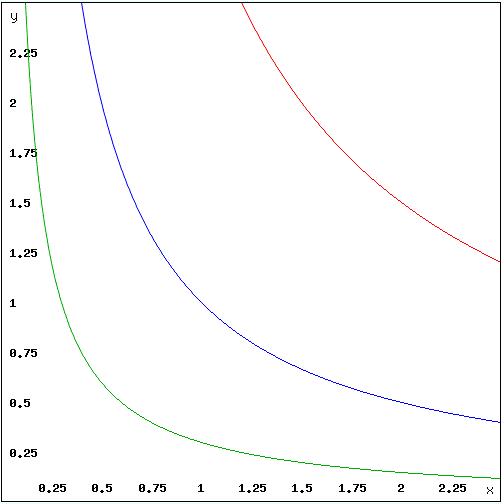 The equation implies that, for a given number of particles (for some given substance, that is), and for some given temperature, pressure and volume are inversely proportional one to another: P = NkT/V. The curve representing that relationship between P and V has the same shape as the reciprocal function y = 1/x. To be precise, it has the same shape as a rectangular hyperbola with the center at the origin, i.e. the shape of an y = m/x curve, assuming non-negative values for x and y only. The illustration below shows that graph for m = 1, 3 and 0.3 respectively. We’ll need that graph later when looking at more complicated graphs depicting processes during which we will not keep temperature constant—so that’s why I quickly throw it in here.