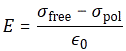 Now that we have σpol, we can use our E = σ/ε0 formula and add the fields from the dielectric and the capacitor plates respectively. Just think about that gaussian surface S, for example. The field there, taking into account that σpol and σfree have opposite signs, is equal to: