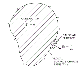 The analysis of the field of a sheet of charge on a conductor is quite complicated, and not quite like the analysis of just a sheet of charge. The analysis for just a sheet of charge was based on the theoretical situation depicted below. We imagined some box with two Gaussian surfaces of area A, and we then used Gauss’ Law to deduce that, if σ was the charge per unit area (i.e. the surface density), the total flux out of the box should be equal to EA + EA = σA/ε0 and, hence, E = (1/2)·σ/ε0. The illustration below shows we should think of two fields with opposite direction, and with a magnitude of (1/2)·σ/ε0 each.