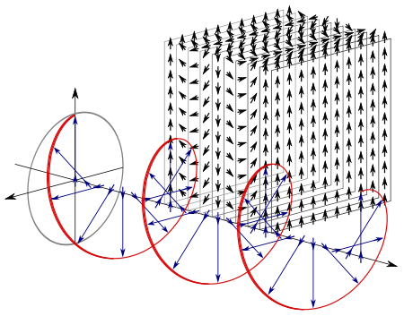 Hmm… I can feel your skepticism here. You’ll say I am arbitrarily restricting the field of analysis… Well… Yes. For the moment. It’s not a reasonable restriction though. As I mentioned above, the field of a plane wave may still vary in both the y- and z-directions, as shown in the illustration below (for which the credit goes to Wikipedia), which visualizes the electric field of circularly polarized light. In any case, don’t worry too much about. Let’s get back to the analysis. Just note we’re talking plane waves here. We’ll talk about non-plane waves i.e. incoherent light waves later. 🙂