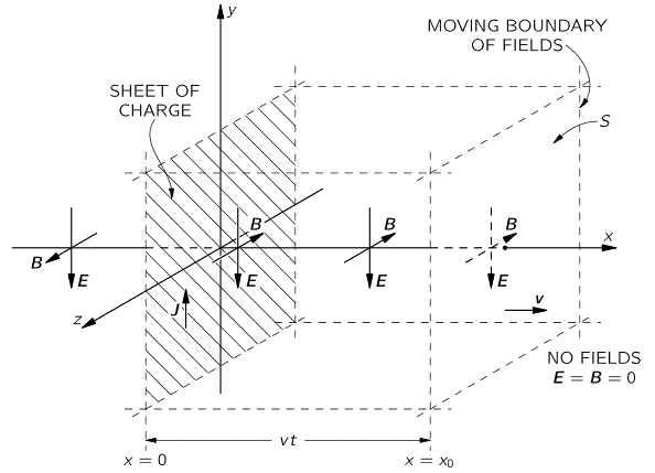 What I want to do here is show how we can get from those equations to some kind of wave equation: an equation that describes how a field actually travels through space. So… Well… Let’s first look at that very particular wave function we used in the previous post to prove that electromagnetic waves propagate with speed c, i.e. the speed of light. The fields were very simple: the electric field had a y-component only, and the magnetic field a z-component only. Their magnitudes, i.e. their magnitude where the field had reached, as it fills the space traveling outwards, were given in terms of J, i.e. the surface current density going in the positive y-direction, and the geometry of the situation is illustrated below.