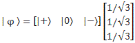 We’ll stick to the symbols we used already, and so we’ll just assume a particle enters into the apparatus in some state φ, and that it comes out in some state χ. Continuing the example of spin-one particles, and assuming our beam has not been filtered – so, using lingo, we’d say it’s unpolarized – we’d say there’s a probability of 1/3 for being either in the ‘plus’, ‘zero’, or ‘minus’ state with respect to whatever representation we’d happen to be working with, and the related amplitudes would be 1/√3. In other words, we’d say that φ is defined by C+ = 〈 +S | φ 〉, C0 = 〈 0S | φ 〉, and C− = 〈 −S | φ 〉, with C+ = C0 = C− = 1/√3. In fact, using that | φ 〉 = |+S〉 C+ + |0S〉 C0 + |+S〉 C− expression we invented above, we’d write: | φ 〉 = (1/√3)|+S〉 + (1/√3)|0S〉 C0 + (1/√3)|+S〉 C− or, using ‘matrices’—just a row and a column, really: