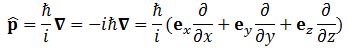 Now that does not look very simple. You might think that the ∂/∂x operator reflects our velocity operator, but… Well… No: ∂/∂t gives us a time rate of change, while ∂/∂x gives us the spatial variation. So it’s not the same. Also, that ħ/i factor is quite intriguing, isn’t it? We’ll come back to it in the next section of this post. Let me just give you the three-dimensional equivalent which, remembering that 1/i = −i, you’ll understand to be equal to the following vector operator: