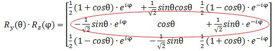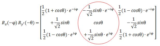 Let’s first calculate the Ry(θ) Rz matrix to see if we get those formulas for the angular dependence of the amplitudes. It’s the product of the Ry(θ) and Rz matrices, which I reproduce below.