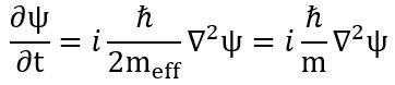 This is, of course, Schroedinger’s equation in free space, which means there are no other charges around and we, therefore, have no potential energy terms here. The rather enigmatic concept of the effective mass (which is half the total mass of the electron) is just the relativistic mass of the pointlike charge as it whizzes around at lightspeed, so that is the motion which Schroedinger referred to as its Zitterbewegung (Dirac confused it with some motion of the electron itself, further compounding what we think of as de Broglie’s mistaken interpretation of the matter-wave as a linear oscillation: think of it as an orbital oscillation). The 1/2 factor is there in Schroedinger’s wave equation for electron orbitals, but he replaced the effective mass rather subtly (or not-so-subtly, I should say) by the total mass of the electron because the wave equation models the orbitals of an electron pair (two electrons with opposite spin). So we might say he was lucky: the two mistakes together (not accounting for spin, and adding the effective mass of two electrons to get a mass factor) make things come out alright. 🙂