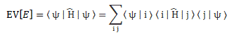 In addition, the Hamiltonian operator also has other uses. The one I should really mention here is that you can calculate the average or expected value (EV[X]) of the energy of a state ψ (i.e. any state, really) by first operating on | ψ 〉 with the Hamiltonian, and then multiplying 〈 ψ | with the result. That sounds a bit complicated, but you’ll understand it when seeing the mathematical expression, which we can write as: