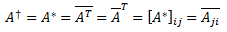 Let me formally define the conjugate or Hermitian transpose here: the conjugate transpose of an m-by-n matrix A with complex elements is the n-by-m matrix A† obtained from A by taking the transpose (so we write the rows as columns and vice versa) and then taking the complex conjugate of each element (i.e. we switch the sign of the imaginary part of the complex number). A† is read as ‘A dagger’, but mathematicians will usually denote it by A*. In fact, there are a lot of equivalent notations, as we can write: