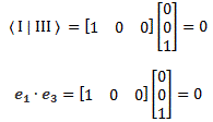 I just combined the notations for 〈 I | and | III 〉. Can you now see the similarity between the the 〈 i | j〉 bra-ket and the ei·ej product? It really is the same: you just need to respect the subtleties in regard to writing the 〈 i | and | j 〉 vector, or the ei and ej vectors, as a row vector or a column vector respectively.