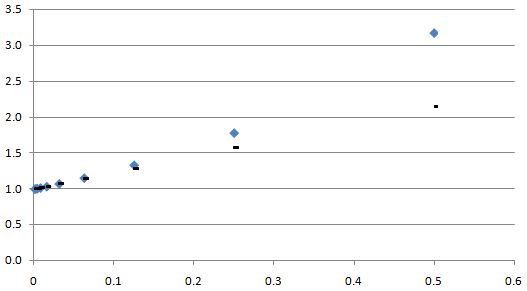 Good question! In order to try to define what’s ‘good enough’, I’ll turn the whole thing on its head. In the table below, I calculate backwards from e1 = e by taking successive square roots of e. Huh? What? Patience, please! Just go along with me for a while. First, I calculate e1/2, so our fraction ε, which I’ll just write as x, is equal to 1/2 here, so the approximation for e1/2 is 1 + 1/2 = 1.5. That’s off. How much? Well… The actual value of e1/2 is about 1.648721 (see the table below (or use a calculator or spreadsheet yourself): note that, because I copied the table from Excel, ex is shown as e^x). Now, 1.648721 is 1.5 + 0.148721, so our approximation (1.5) is about 9% off (as compared to the actual value). Not all that much, but let’s see how we can improve. Let’s take the square root once again: (e1/2)1/2 = e1/4, so x = 1/4. And then I do that again, so I get e1/8, and so on and so on. All the way down to x = 1/1024 = 1/210, so that’s ten iterations. Our approximation 1 + x (see the fifth/last column in the table below is then equal to 1 + 1/1024 = 1 + 0.0009765625, which we rounded to 1.000977 in the table.