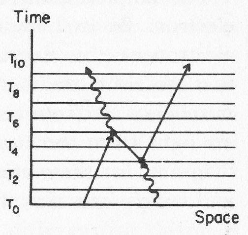 In the Feynman diagram below, we see a photon disintegrating, at time t = T3, into a positron and an electron. The positron (a positron is an electron with positive charge basically: it’s the electron’s anti-matter counterpart) meets another electron that ‘happens’ to be nearby and the annihilation results in (another) high-energy photon being emitted. While, as Feynman underlines, “this is a sequence of events which has been observed in the laboratory”, how is all this possible? We create matter – an electron and a positron both have considerable mass – out of nothing here ! [Well… OK – there’s a photon, so that’s some energy to work with…]