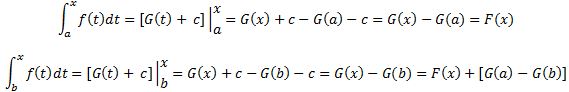 Now, remember that we just need one antiderivative to solve a definite integral, not the whole family, and which one we’ll get will depend on that value a (or x0as that fixed point is being referred to in the formula used the illustration above), so it will depend on what choice we make there for the lower boundary. Indeed, you can work that out for yourself by just solving ∫[x0, x] f(t)dt for two different values of x0 (i.e. a and b in the example below):