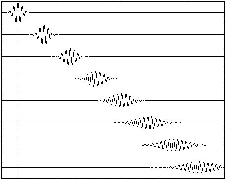 Let’s go back to our electron traveling in a more or less straight path. What’s the shape of the solution for that one? It could be anything. Well… Almost anything. As said, the only condition we can impose is that the envelope of the wave packet – its ‘general’ shape so to say – should not change. That because we should not have dispersion – as illustrated below. [Note that this illustration only represent the real or the imaginary part – not both – but you get the idea.]
