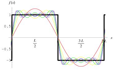 The shape above is usually referred to as a Gaussian wave packet, because of the nice normal (Gaussian) probability density functions that are associated with it. But we can also imagine a ‘square’ wave packet: a somewhat weird shape but – in terms of the math involved – as consistent as the smooth Gaussian wave packet, in the sense that we can demonstrate that the wave packet is made up of an infinite number of waves with an angular frequency ω that is linearly related to their wave number k, so the dispersion relation is ω = ak + b. [Remember we need to impose that condition to ensure that our wave packet will not dissipate (or disperse or disappear – whatever term you prefer.] That’s shown below: a Fourier analysis of a square wave.