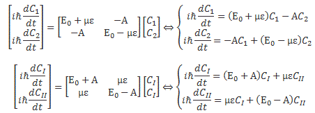 If we know the amplitudes C+ and C− of spin one-half particles with respect to a reference frame S, and we then use new base states, defined with respect to a reference frame T which is obtained from S by a rotation α around the z-axis, the new amplitudes are given in terms of the old by the following formulas: