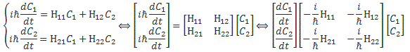 Bon… I have to stay away from these questions as for now—we need to move on with the math here—but I will come back to it later. But… Well… Talking math, I should note a very interesting mathematical point here. We have these transformation matrices for amplitudes, right? Well… Not yet. In fact, the coefficient of these matrices are exactly what we’re going to try to derive in this post, but… Well… Let’s assume we know them already. 🙂 So we have a 2-by-2 matrix to go from S to T, from T to U, and then one to go from S to U without going through T, which we can write as RST, RTU, and RSU respectively. Adding the subscripts for the base states in each representation, the equivalence between the (a) and (b) situations can then be captured by the following formula: