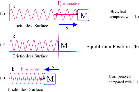 Hooke’s ‘Law’ – i.e. the law describing the force on a mass on a stretched or compressed spring – is not a fundamental law: eventually the spring will stop. Yes. It will stop even if when it’s in a horizontal position and with the mass moving on a frictionless surface, as assumed above: the forces between the atoms and/or molecules in the spring give the spring the elasticity which causes the mass to oscillate around some equilibrium position, but some of the energy of that continuous movement gets lost in heat energy (yes, an oscillating spring does actually get warmer!) and, hence, eventually the movement will peter out and stop.