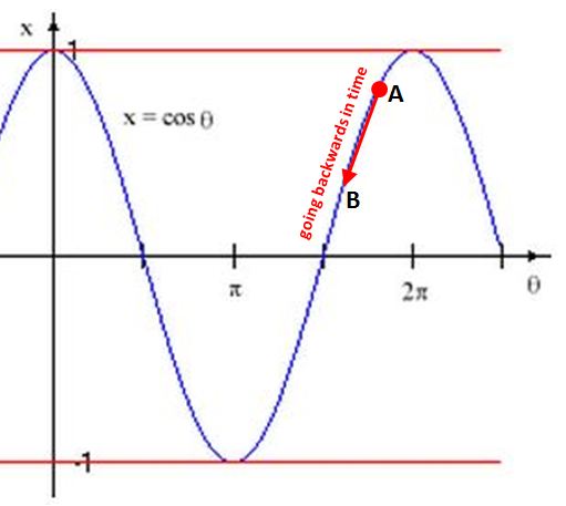 2. However, we could imagine it moving from point A to B if we would reverse the direction of the force. Indeed, the force is equal to –kx and reversing its direction is equivalent to flipping our graph around the horizontal axis (i.e. the time axis), or to shifting the time axis left or right with an amount equal to π (note that the ‘time’ axis is actually represented by the phase, but that’s a minor technical detail and it does not change the analysis: we just measure time in radians here instead of seconds).