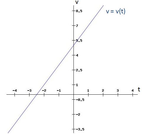 Huh? Negative velocity? Here’s the difference with the movie: in that movie that we are playing backwards, our car, our rocket, or the glass falling from a table or a pedestal would come to rest at some point back in time. We can calculate that point from our velocity equation v(t) = v(0) + at. In the example below, our object started accelerating 2.5 seconds ago, at point t = –2.5. But, unlike what we would see happening in our backwards-playing movie, we see that object not only stopping but also reversing its direction, to go in the same direction as we saw it going when we’re watching the movie before we hit the ‘Play Backwards’ button. So, yes, the velocity of our object changes sign as it starts following the trajectory on the left side of the graph.