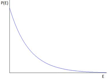 The second key assumption of Planck as he worked towards a solution of the blackbody radiation problem was that the probability (P) of occupying a level of energy E is P(EαeE/kT. OK… Why not? But what is this assumption really? You’ll think of some ‘bell curve’, of course. But… No. That wouldn’t make sense. Remember that the energy has to be positive. The general shape of this P(E) curve is shown below.