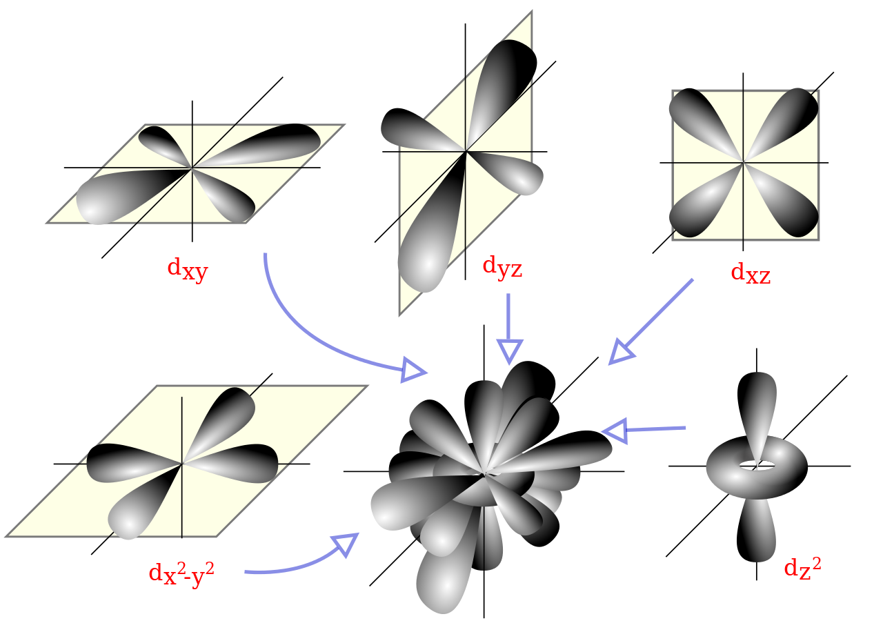 3. Of course, there are even more differences between photons and electrons than the two key differences I mentioned above. Indeed, I’ve simplified a lot when I wrote what I wrote above. The wavefunctions of electrons in orbit around a nucleus can take very weird shapes, as shown in the illustration below—and please do google a few others if you’re not convinced. As mentioned above, they’re so-called standing waves, because they occupy a well-defined position in space only, but standing waves can look very weird. In contrast, traveling plane waves, or envelope curves like the one above, are much simpler.