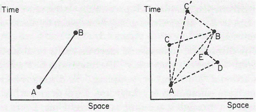 So where are all the strange non-linear paths here? Let me, in order to make sure you get what I am saying here, insert that illustration with the three crazy routes once again. What we’ve got above (Figure 33 and 34) is not like that. Not at all: we’ve got only straight lines there! Why? The answer to that question is easy: the crazy paths don’t matter because their amplitudes cancel each other out, and so that allows Feynman to simplify the whole situation and show all the relevant paths as straight lines only.