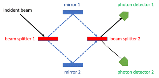 The classical explanation is easy enough: the two beams arrive in phase or, alternatively, out of phase and we, therefore, have constructive or destructive interference when recombining them. However, when we want to analyze this in terms of one single photon, this classical picture becomes quite complicated. Physicists will tell you the photon cannot actually split itself, and they will start talking about amplitudes – based on which they will calculate probabilities of this or that happening – but they will never explain what is actually happening.