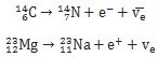 An example of β decay is the decay of carbon-14 (C-14) into nitrogen-14 (N-14), and an example of β+ decay is the decay of magnesium-23 into sodium-23. C-14 and N-14 have the same mass but they are different atoms. The decay process is described by the equations below: