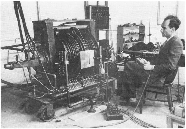 The first two pictures below document the first experimental confirmation of the existence of positrons by Carl Anderson, back in 1932 (and, no, he’s not Danish but American), for which he got a Nobel Prize. The magnetic field which gives the positron some curvature—the trace of which can be seen in the image on the right—is generated by the coils around the chamber. Note the opening in the coils, which allows for taking a picture when the supersaturated vapor is suddenly being decompressed – and so the charged particle that goes through it leaves a trace of ionized atoms behind that act as ‘nucleation centers’ around which the vapor condenses, thereby forming tiny droplets. Quite incredible, isn’t it? One can only admire the perseverance of these early pioneers.