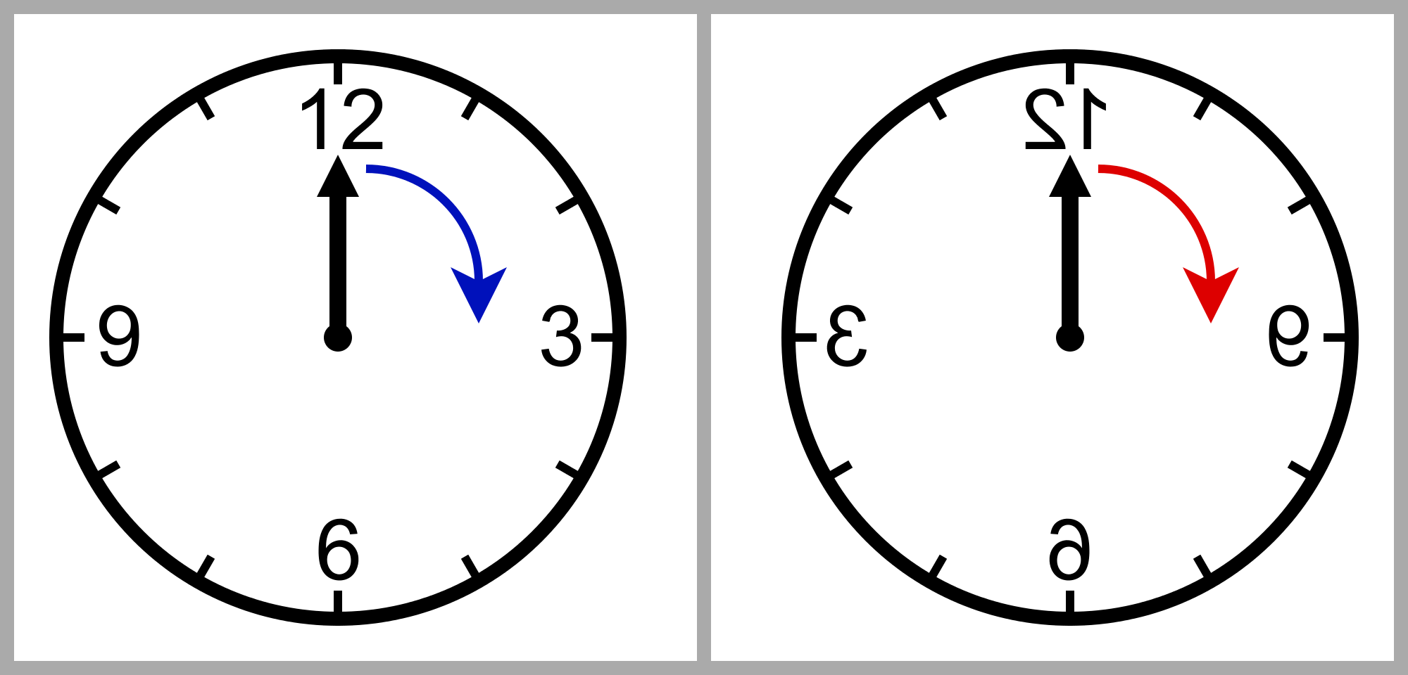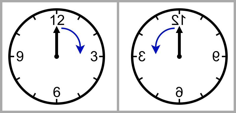 Rotational symmetry is a symmetry as well, and the fact that the laws of Nature are invariant under rotation is actually less obvious than you may think (because you’re used to the idea). However, that’s not the point here: rotational symmetry is something else than reflection (mirror) symmetry. Let me make that clear by showing how the clock might run when it would not respect P-symmetry.