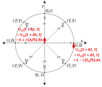 You’ll say: why don’t you try to give it some kind of geometrical or whatever meaning? OK. Let’s try. State |1〉 is obviously like minus state |2〉 in space, so let’s see what happens when we equate |1〉 to 1 on the real axis, and |2〉 to −1. Geometrically, that corresponds to the (1, 0) and (−1, 0) points on the unit circle. So let’s multiply those points with (1/√2, −1/√2) and (1/√2, 1/√2) respectively. What do we get? Well… What product should we take? The dot product, the cross product, or the ordinary complex-number product? The dot product gives us a number, so we don’t want that. [If we’re going to represent base states by vectors, we want all states to be vectors.] A cross product will give us a vector that’s orthogonal to both vectors, so it’s a vector in ‘outer space’, so to say. We don’t want that, I must assume, and so we’re left with the complex-number product, which projects our (1, 0) and (−1, 0) vectors into the (1/√2, −1/√2)·(1, 0) = (1/√2−i/√2)·(1+0·i) = √2−i/√2 = (1/√2, −i/√2) and (1/√2, 1/√2)·(−1, 0) = (1/√2+i/√2)·(−1+0·i) = −√2−i/√2 = (−1/√2, −i/√2) respectively.